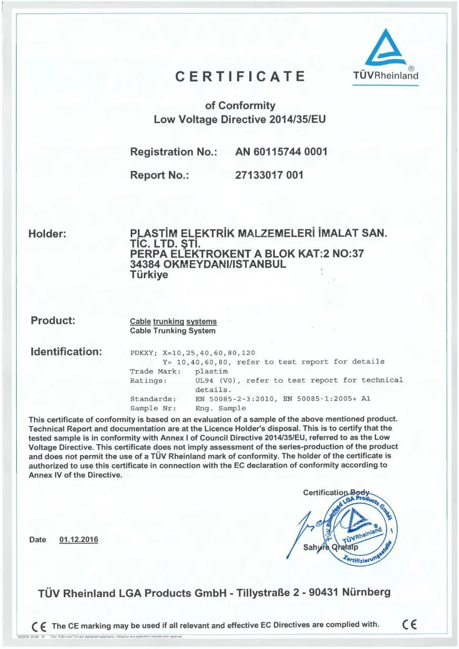 PLASTIM ELEKTRIK werd opgericht in 2008 en is vandaag een van de toonaangevende producenten in Turkije van ABS‑schakelkasten, producten voor de klimaatregeling van elektrische panelen, geperforeerde kabelkanalen, verwarmingselementen enz. Momenteel exporteert PLASTIM zijn producten naar meer dan 50 landen wereldwijd. Het assortiment wordt voortdurend uitgebreid om aan de uiteenlopende eisen van klanten te voldoen.